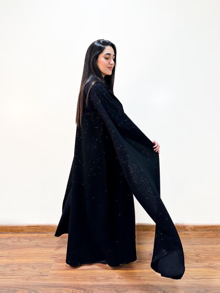 عباية سهرة سوداء لامعة، بقصة كلوش واسعة وكيب متدلية بطريقة أنثوية ناعمة. مصنوعة من أجود أنواع الأقمشة المستوردة الستار. تتميز هذه العباية بلمعانها وتصميمها العصري الأنيق. مناسبة للحفلات والسهرات والمناسبات الخاصة.