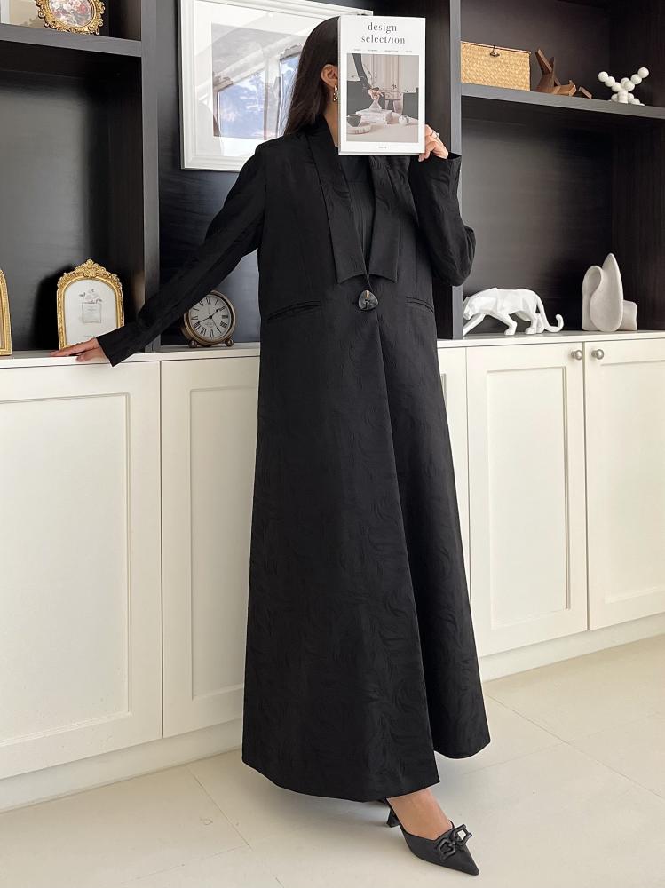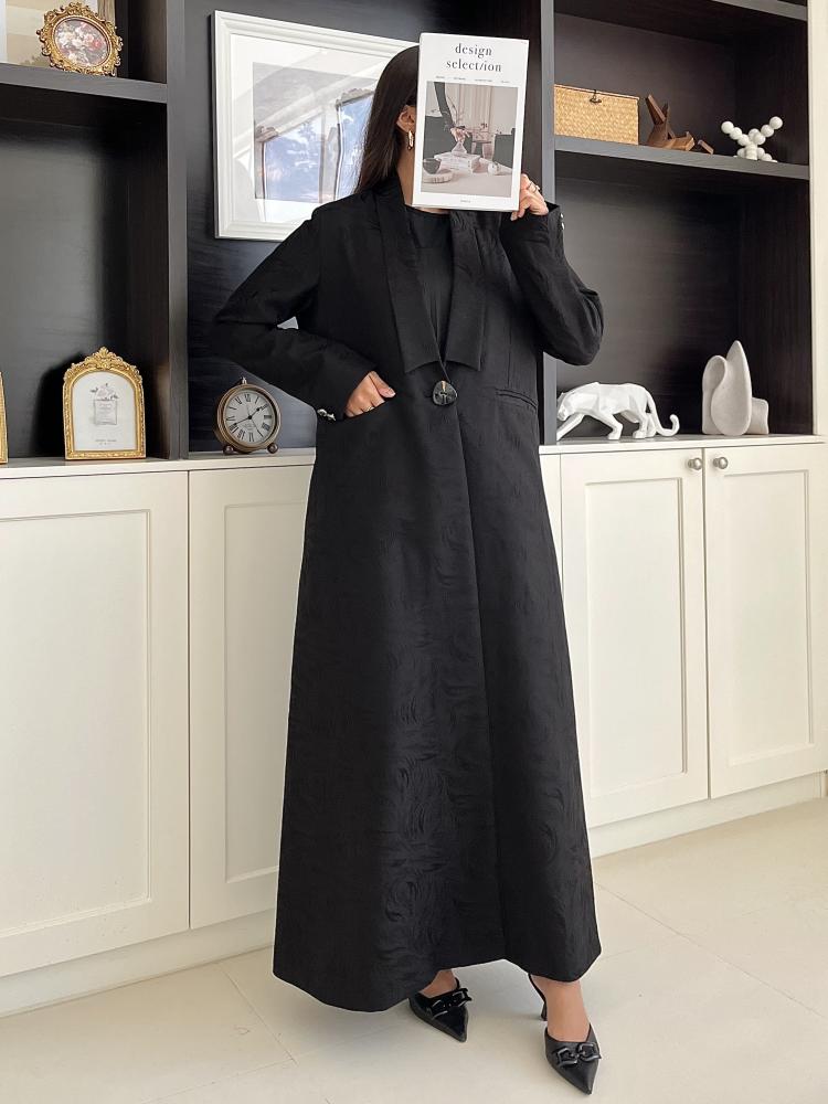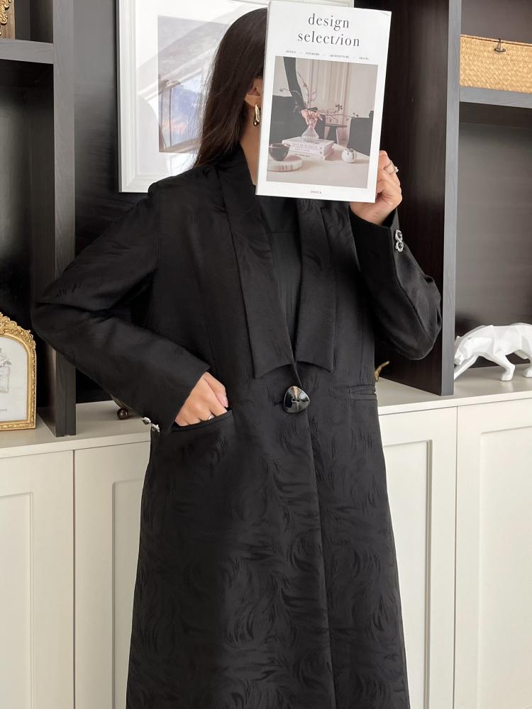 منسوجة من قماش بنقشة بارزة خفيفة تضيف عمق ولمعة ناعمة، وتتفرد بتفصيلة ياقة عصرية مع زر أمامي بارز بلون اسود لامع يمنحها طابعًا راقيًا.