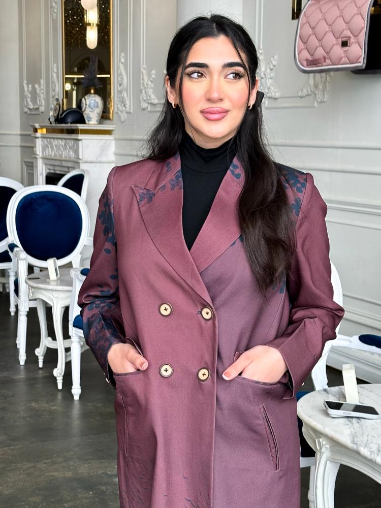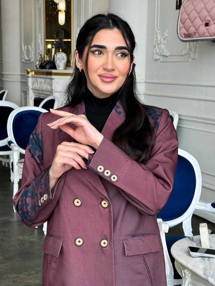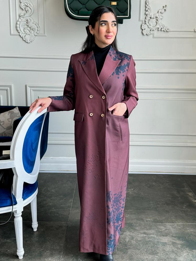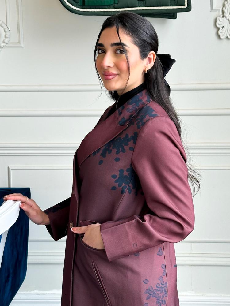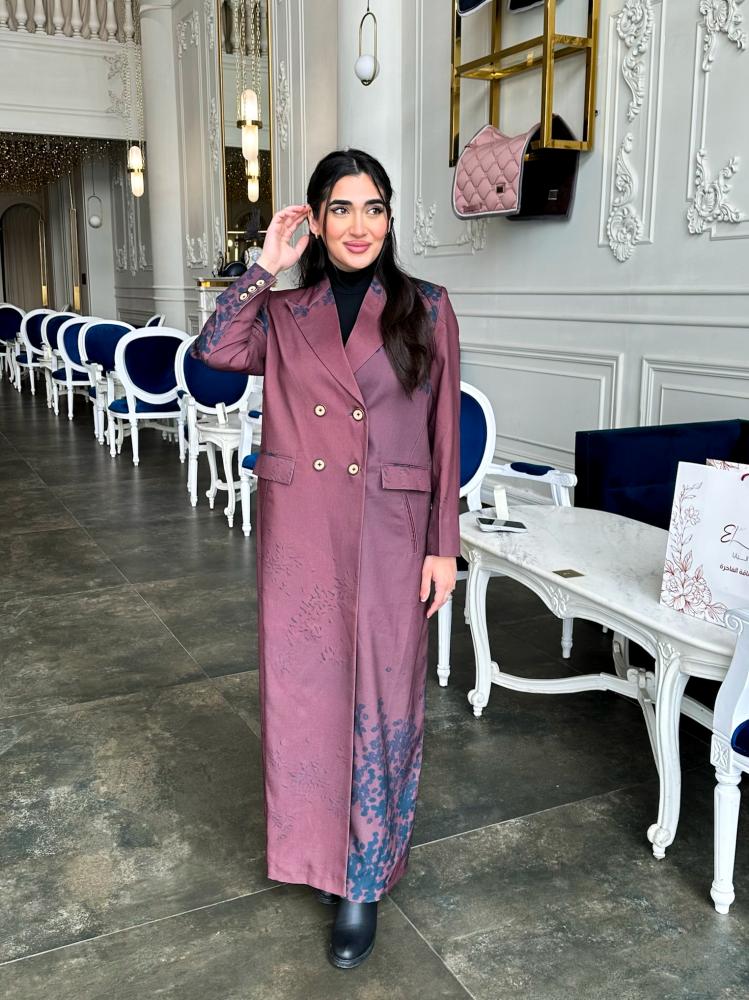 عباية بليزر بتصميم أنيق ولون عنابي مبهر، مصنوعة من الكتان المبطن. تزينها أزرار بنية في الأمام وعلى الأكمام. مناسبة للاستخدام اليومي والاجتماعات الرسمية.