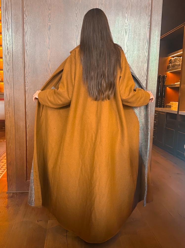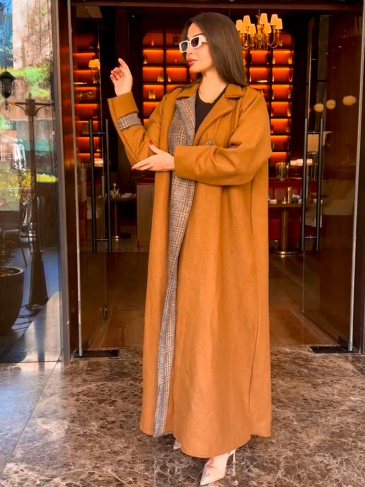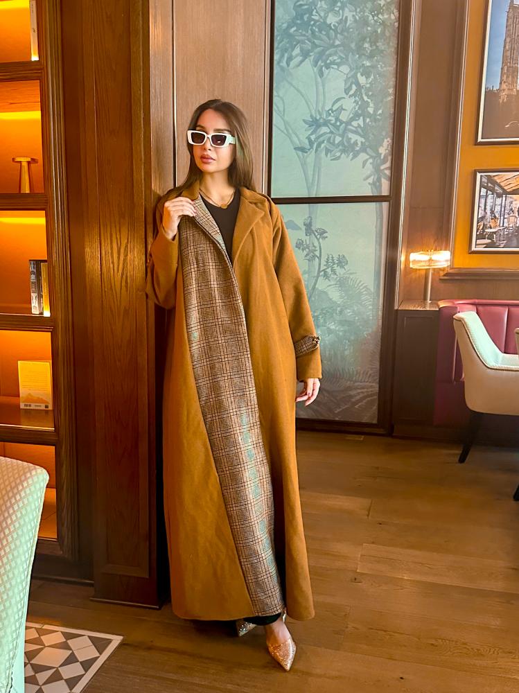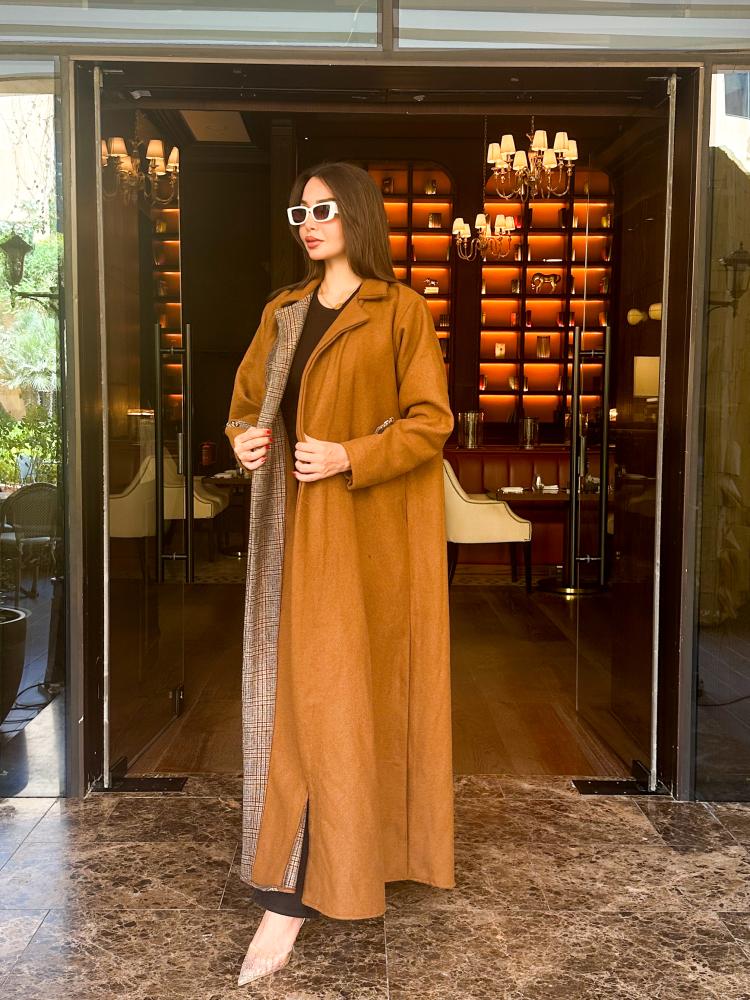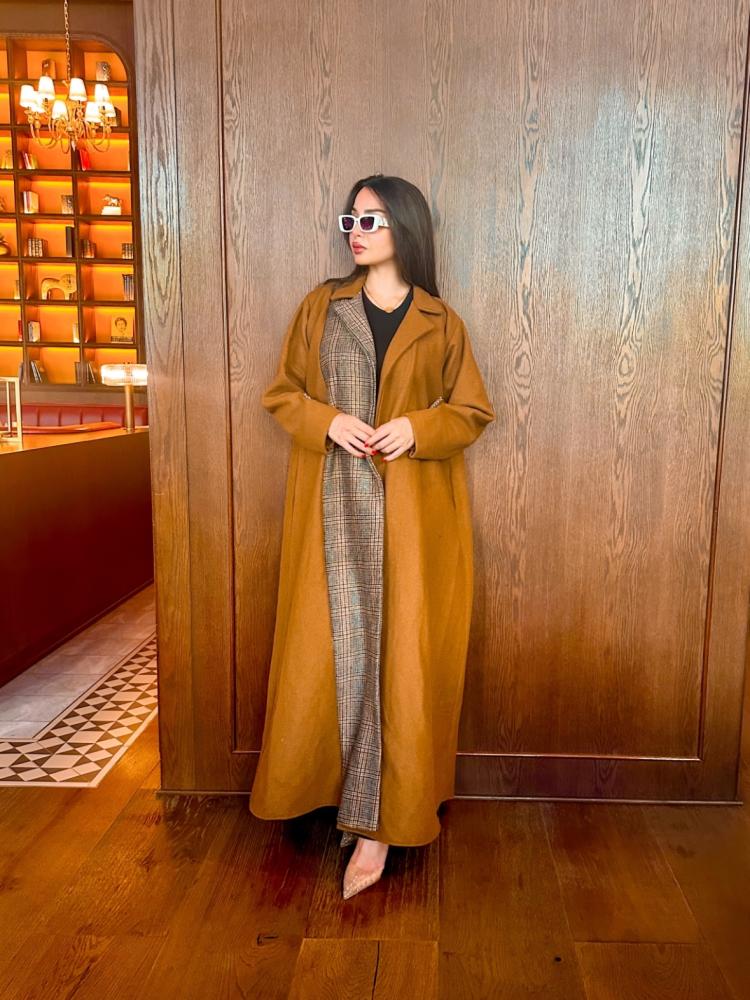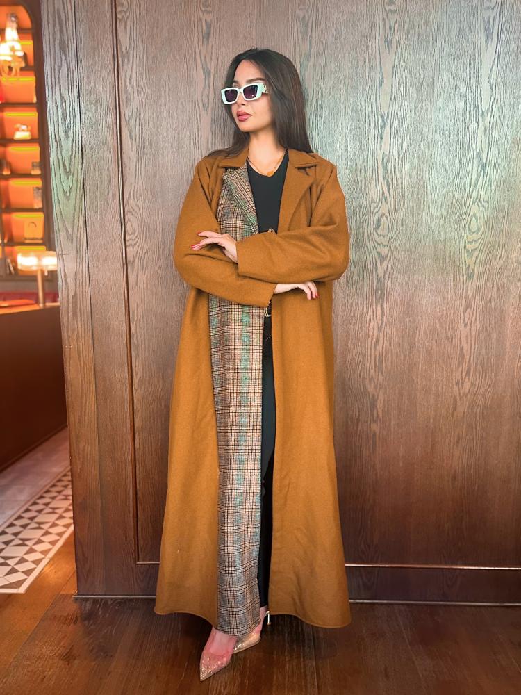 عباية جاكيت جوخ بلون كموني مع تداخل مع جوخ مقلم كاروهات من الأمام من جهة اليمين. عباية شتوية مبطنة بالجوخ المقلم الدافئ وقصة كلوش مريحة. تصميم مناسب للجامعة والدوام ومختلف المناسبات اليومية.