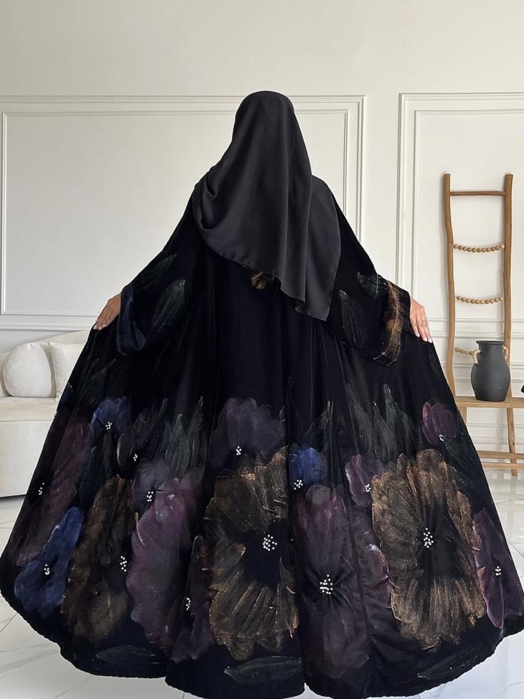 🖤 عباية شتوية كلوش تجسد الفخامة الفنية بأبهى صورها، مصممة للمرأة التي تحب التميز في إطلالاتها المسائية. خامة المخمل SS الأسود الثقيل الناعمة تمنحكِ دفئ وأناقة ملكية، بينما قصة الكلوش الواسعة مع أكمام فلار واسعة لراحة وحركة انسيابية.