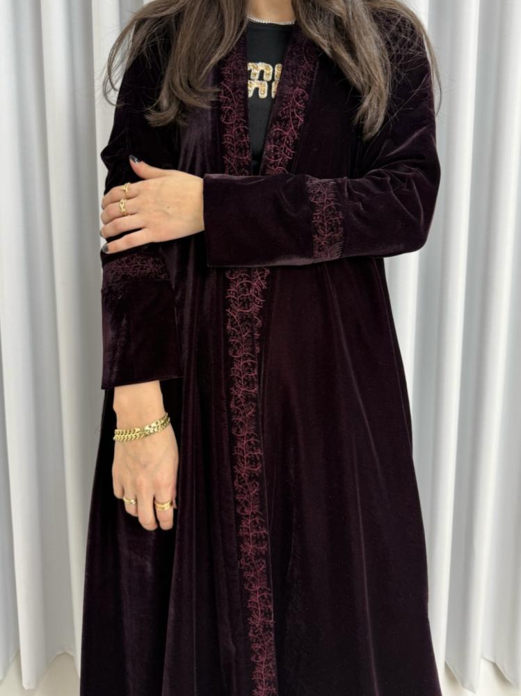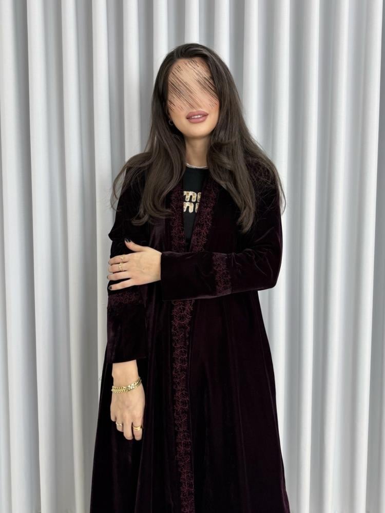 🖤 عباية شتوية نص كلوش بلون برغندي مخملي غامق وأنيق، تجمع بين الدفء الفاخر واللمسة الزخرفية الراقية. اللون البرغندي العميق يمنحكِ حضوراً دافئاً ومميزاً، مع خامة المخمل SS الناعمة التي توفر لمعاناً خفيفاً وملمساً كالحرير يعكس الفخامة في كل حركة.