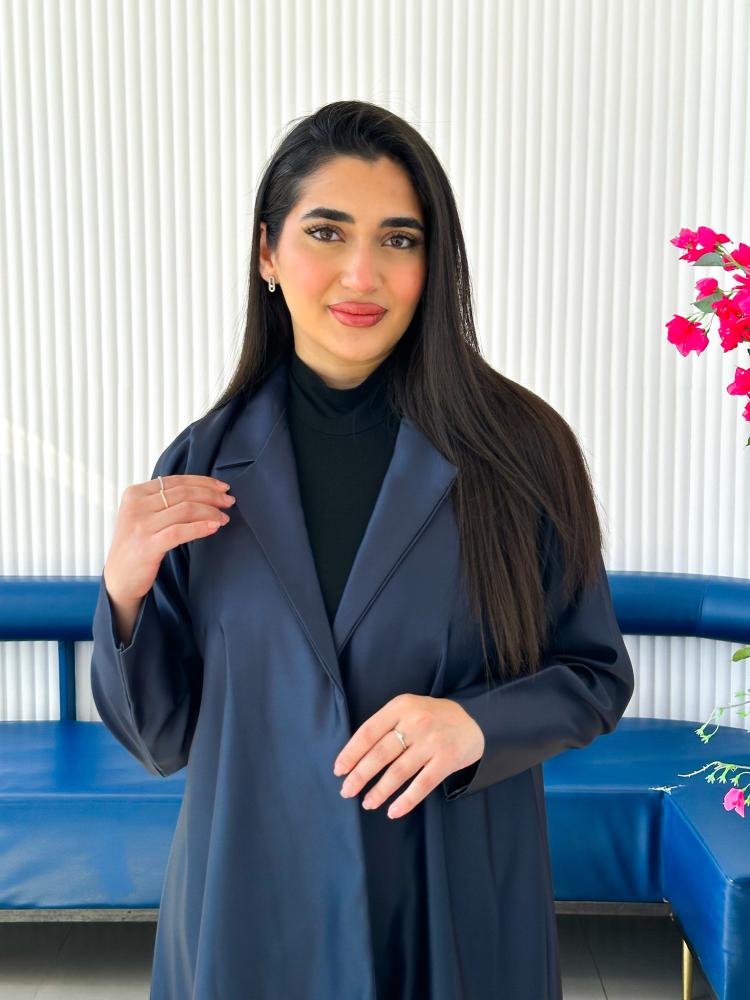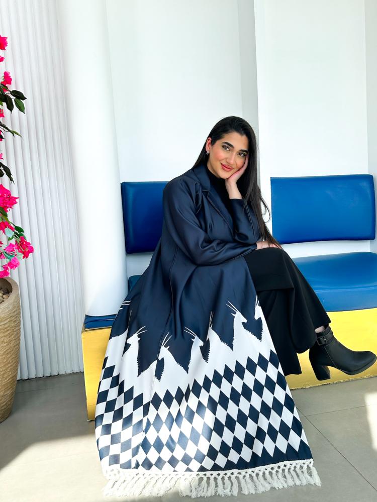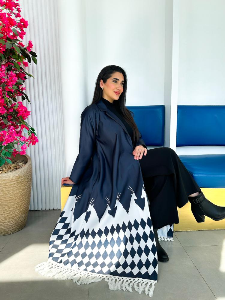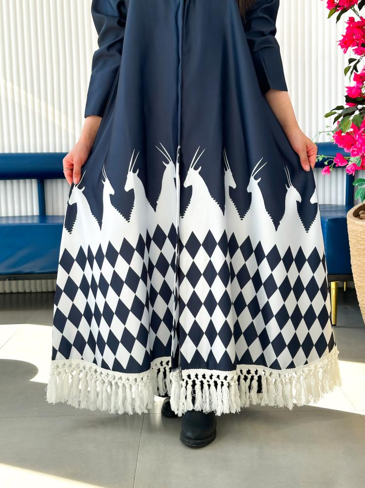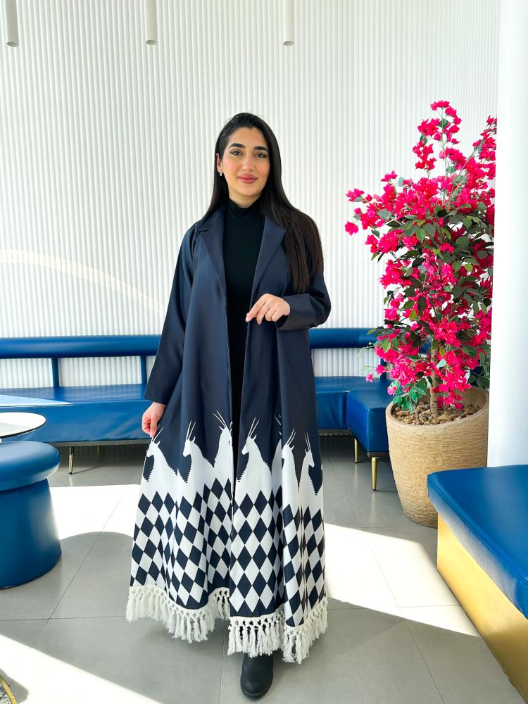 عباية بتصميم أنثوي ناعم باللون الكحلي والأبيض، مصنوعة من قماش التفتة الفاخر. تتميز بنقوش على شكل مربعات شطرنج وحيوان الرنة مع داندش من الأسفل. تتحمل كثرة الاستخدام وتناسب جميع الأوقات ومختلف المناسبات.