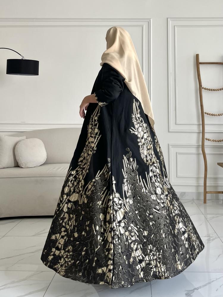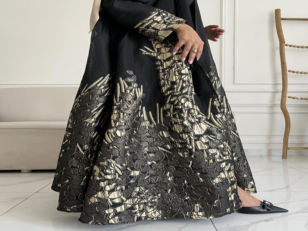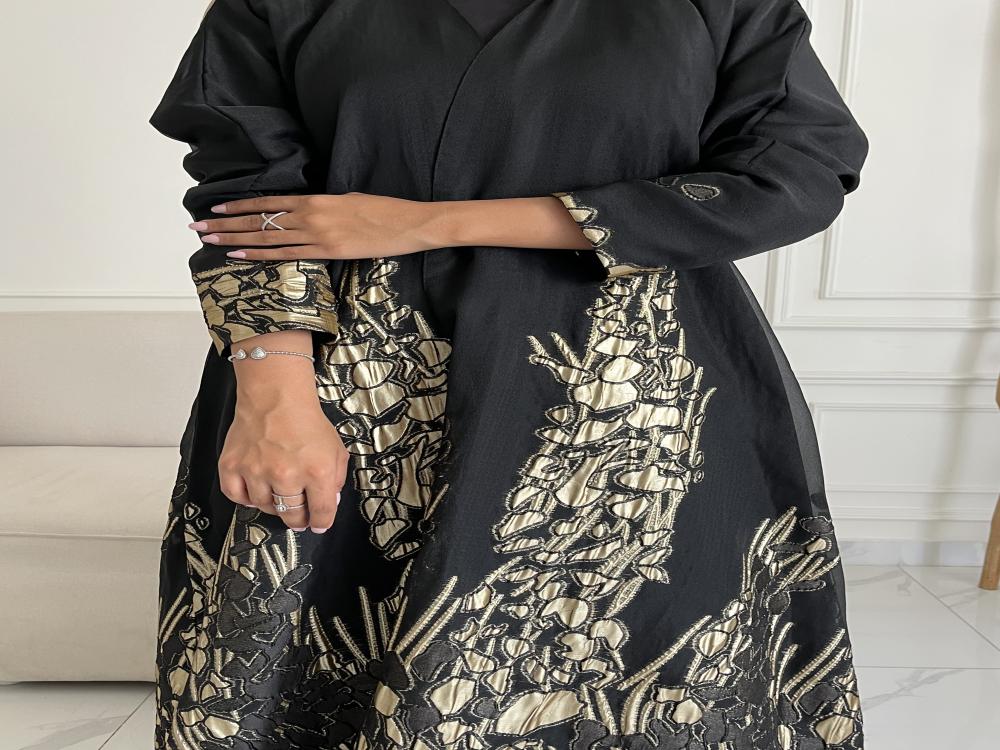 التفاصيل المميزة: نقوش ذهبية من أسفل العباية باتجاه الأعلى حتى المنتصف وعلى الأكمام.