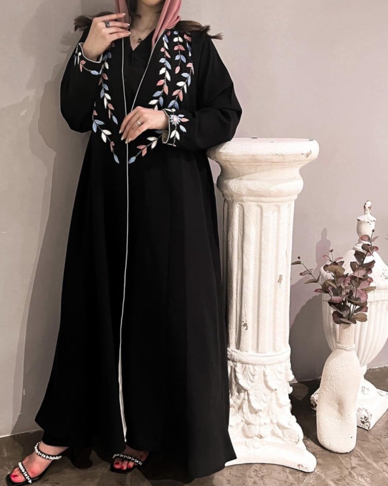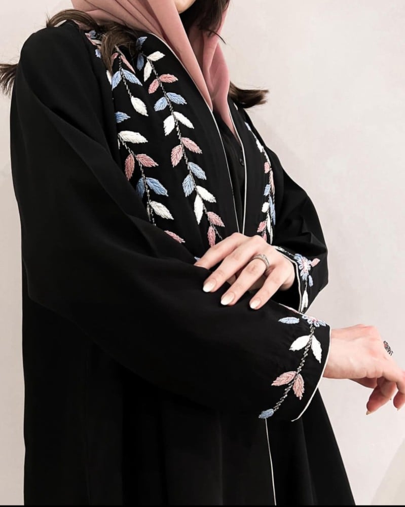 عباية سوداء انيقة بخام الحرير مع درز يدوي على شكل اوراق شجر على الياقة والاكمام