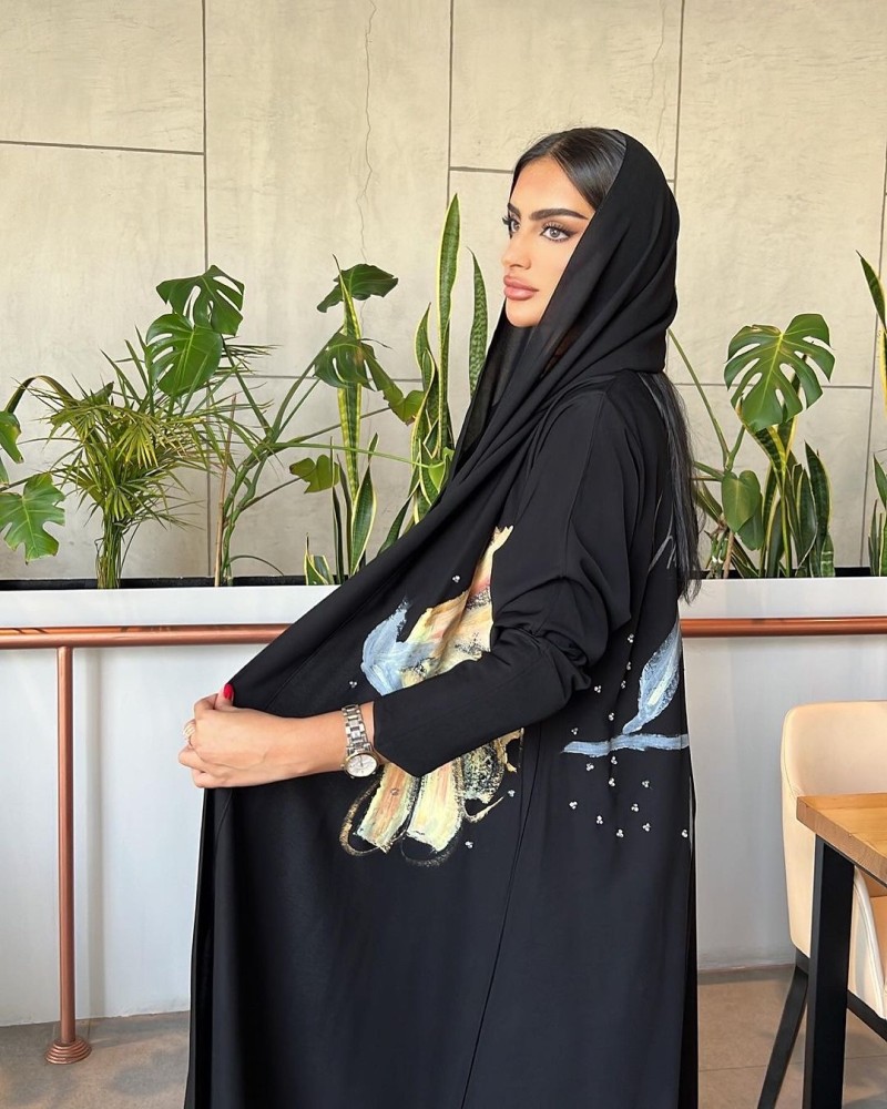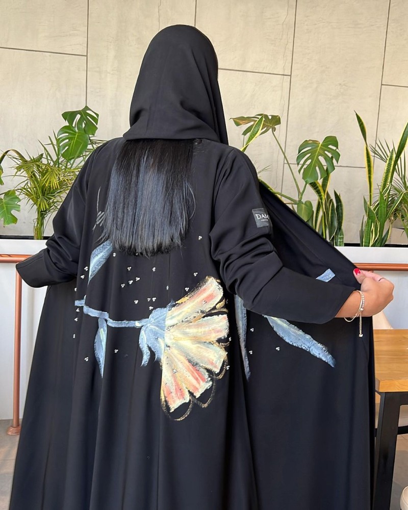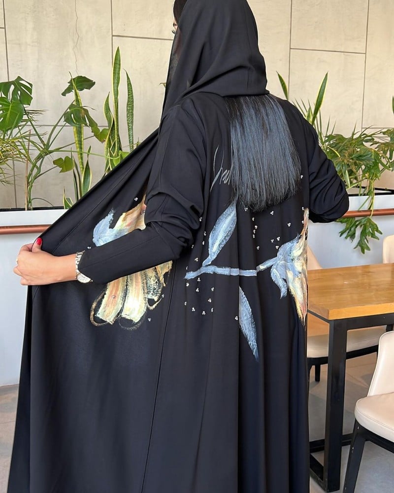 عباية ناعمة بقماش الكريب الصيفي باللون الاسود مع رسم يدوي على شكل وردة