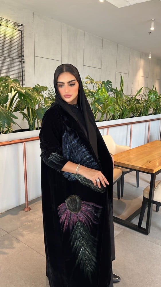 عباية مخمل سوداء مع رسم يدوي على الجانب الايسر