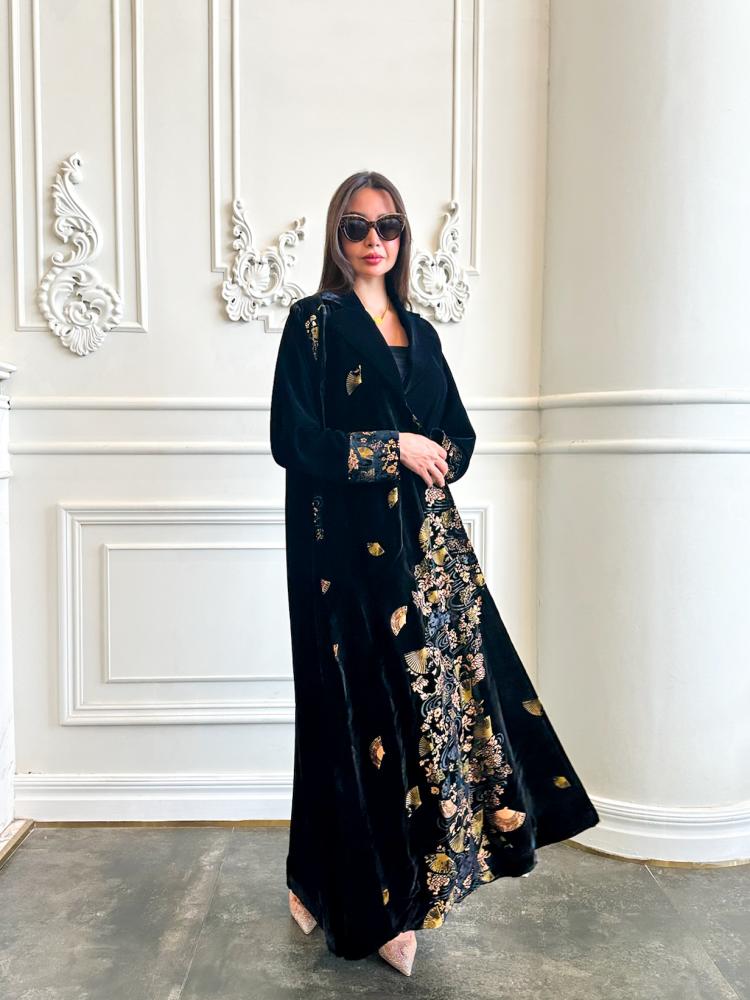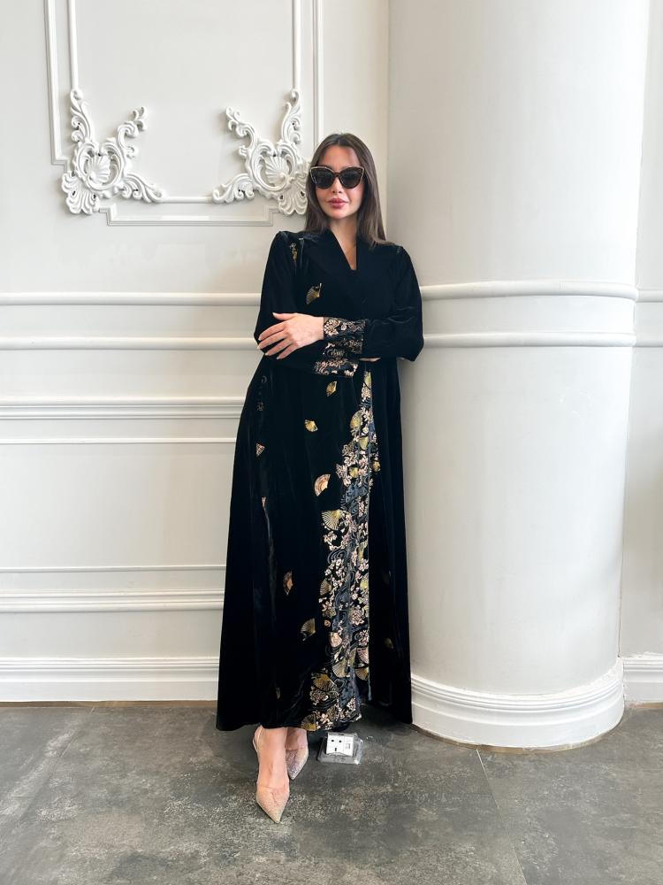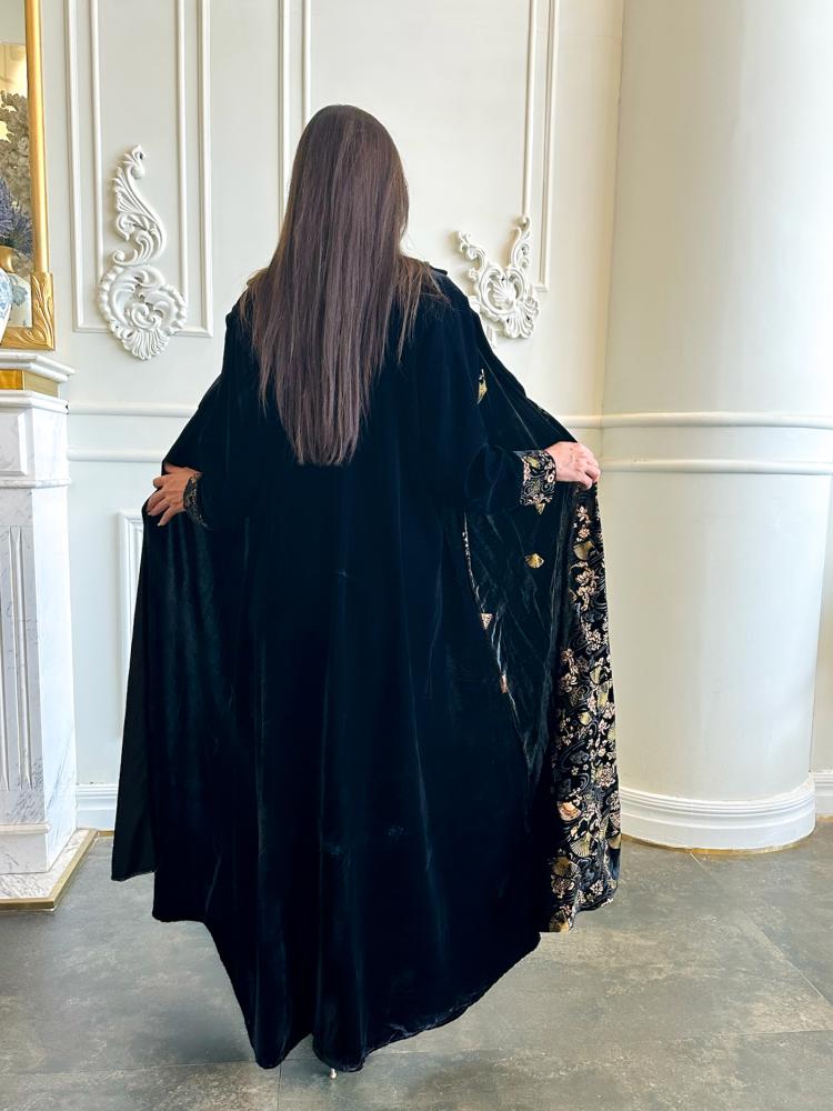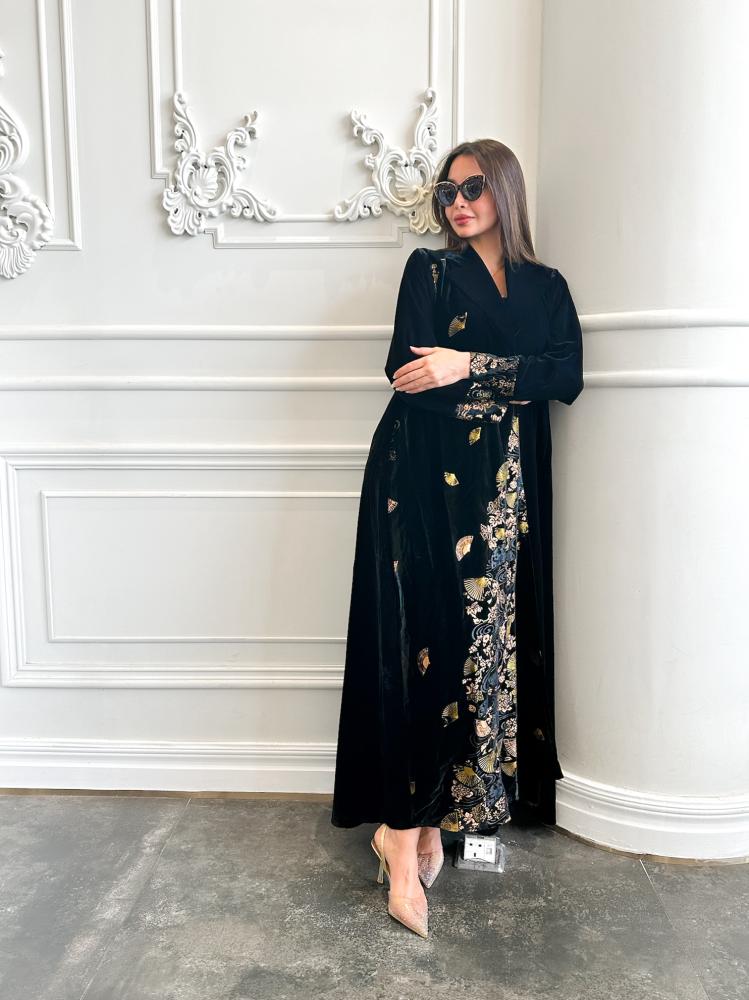 عباية مخمل أسود بتطبيع ورود ذهبية – EL129: تأنقي مع إليانا.
