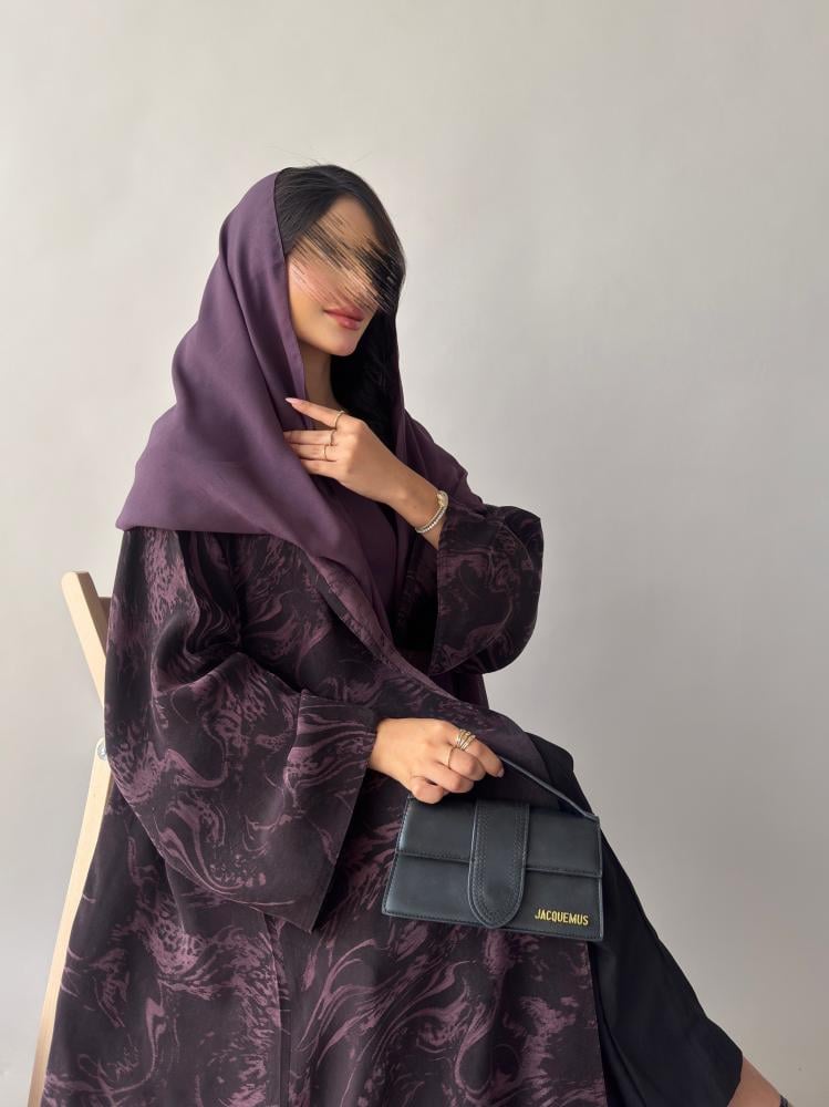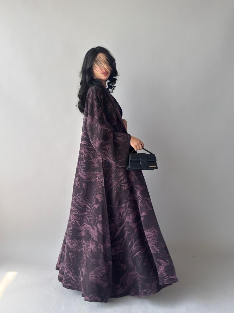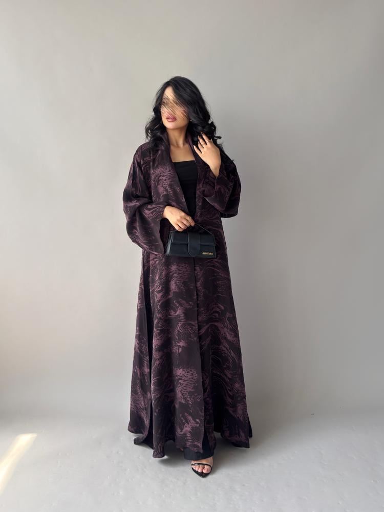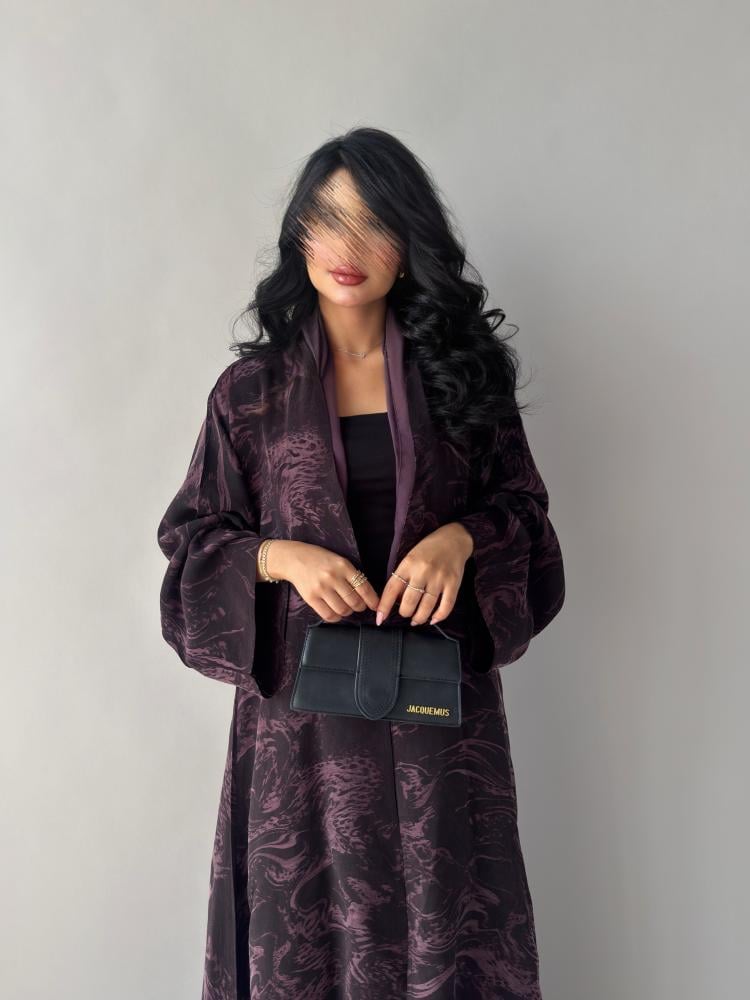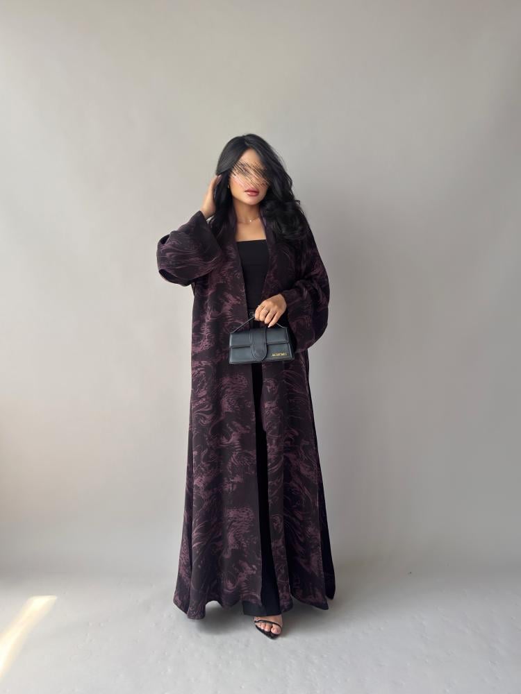 عباية نص كلوش بقصة انسيابية أنيقة وأكمام واسعة مريحة، مصنوعة من قماش جاكار فاخر بنقشات تموجات وردية داكنة تُضفي عليها لمسة فنية ساحرة. عباية يومية باللون الأسود تناسب أجواء الصيف وتجمع بين الراحة والرقي في كل خروجة أو زيارة.